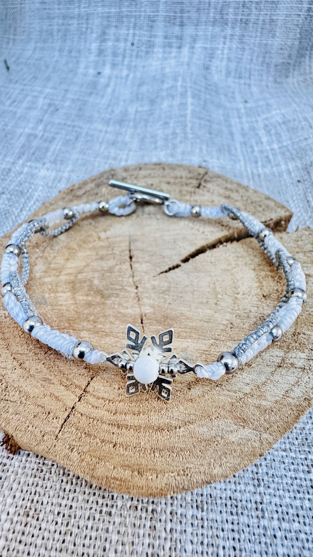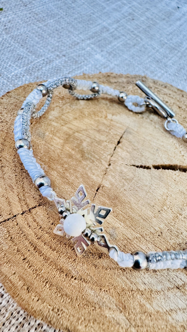 Bracelet tissé en fils blancs et argent Polyester ciré pour des bijoux solides et aux finitions impeccables. élément central en acier inoxydable, Perle Howlite, et perles en acier inoxydable. Fermeture facile et moderne en T acier inoxydable.