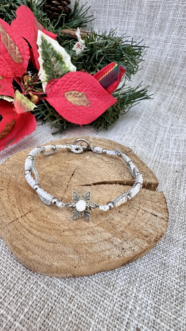 Une collection tout en douceur et lumière givrée. Les fils blancs et argentés se mêlent à la pureté de la Howlite pour des création qui évoquent la neige, la sérénité et la clarté des jours d'hiver.