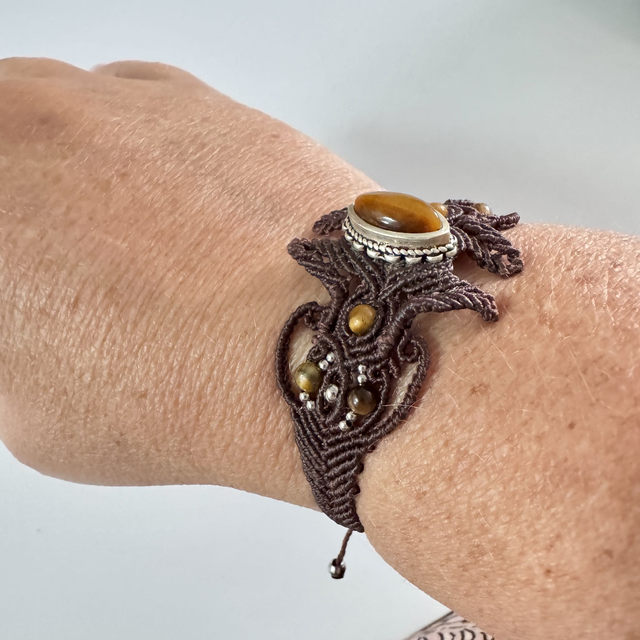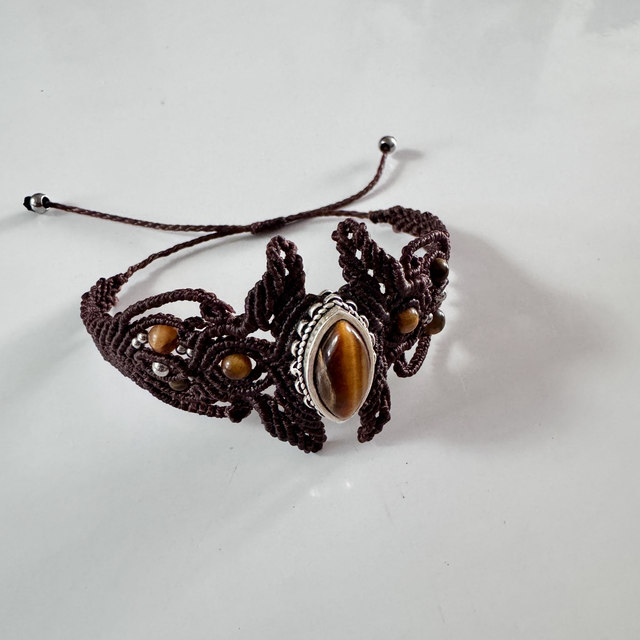En son centre, une pierre Œil du Tigre sertie inox capte la lumière et révèle ses reflets dorés, symbole de protection et de force intérieure.